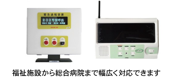 ワイヤレス方式なので、設置工事は短期間で、大掛かりにはなりません。外付けと埋込みのどちらも対応可能となります。1台で60床まで可能で小規模のグループホーム、大きな病院、サービス付高齢者向け住宅に最適です。無線は約300m程到達できる特定小電力型を採用しています。モバイル端末を付けて移動中や夜間も万全です。